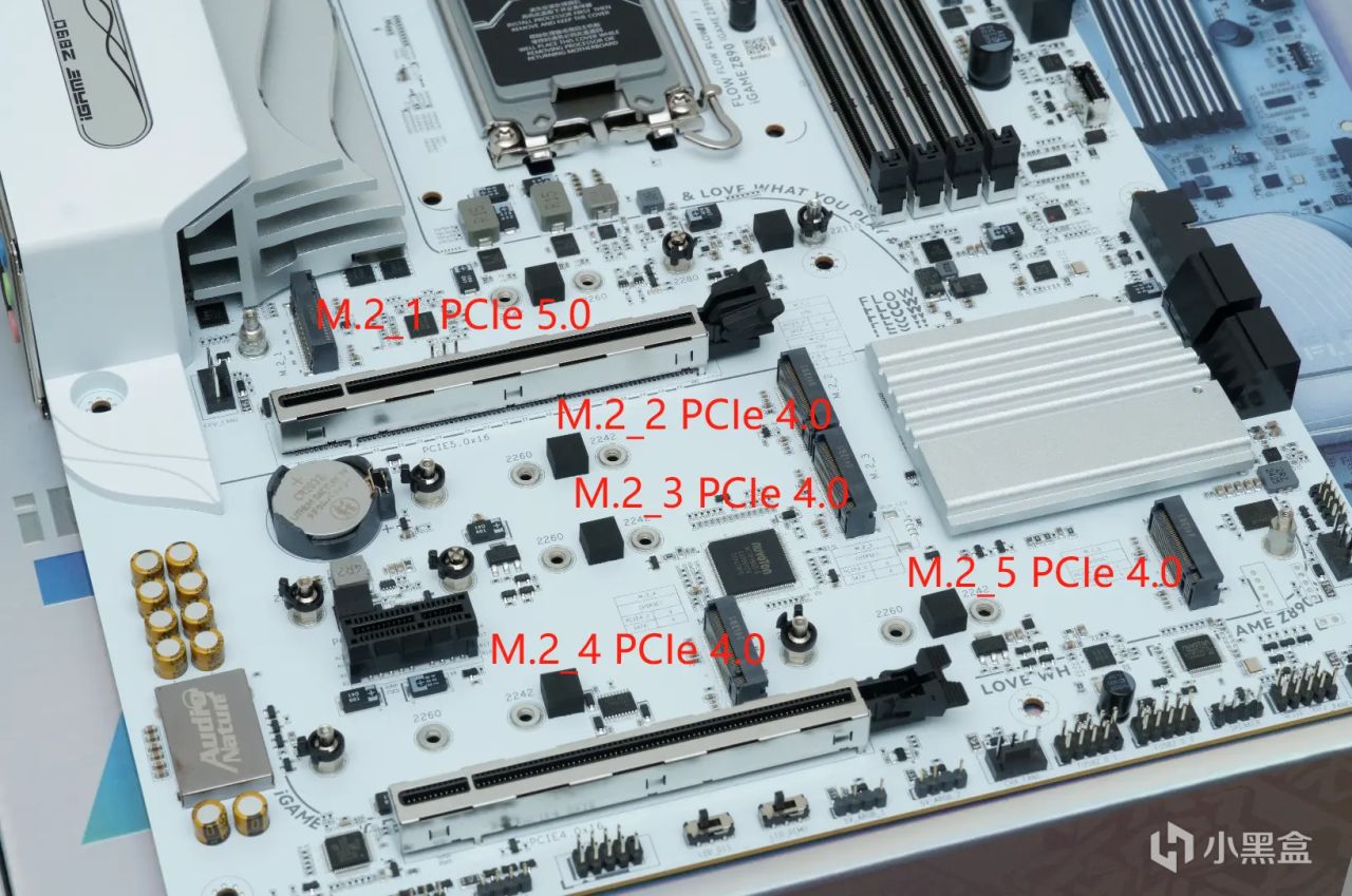 ▲拆下所有的SSD散熱裝甲,我們可以看到,iGame Z890 FLOW共擁有5個M.2 SSD接口,其中M.2_1接口爲PCIe 5.0x4規格,其餘4個均爲PCIe 4.0x4規格,而在尺寸上,M.2_1接口與M.2_3接口最大支持22110的大船SSD,另外3個M.2接口則支持2280標準尺寸的SSD。