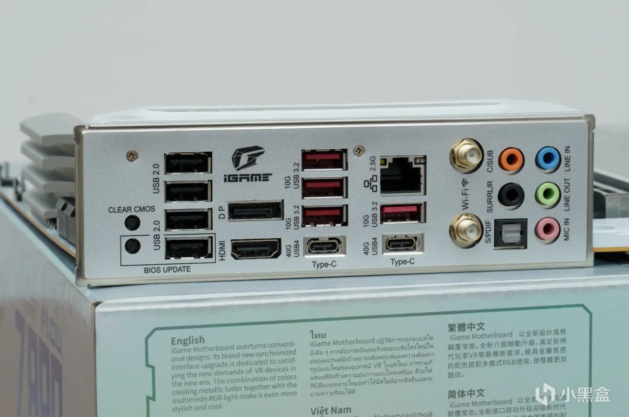 ▲作爲旗艦級別的主板,一體式IO護甲必不可少,iGame Z890 FLOW主板提供了DP1.4\HDMI 2.0接口各一個,2個USB4 接口(40Gbps,兼容雷電協議),4個USB 3.2Gen2接口(紅色,10Gbps),4個USB 2.0接口,1個2.5G有線網絡接口,WiFi 7無線網卡(intel BE200)天線接口以及一組(5個)3.5mm音頻接口與一個光纖音頻輸出接口,可以說非常齊全。