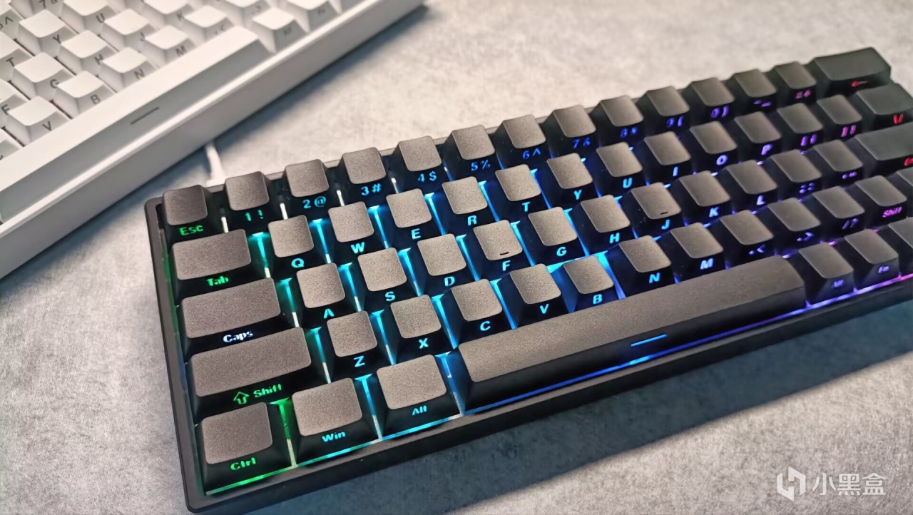 键盘套件整体为塑料,不过手感还是比较不错的,侧边连接处稍微有点割手,在不亮灯下比较朴素。