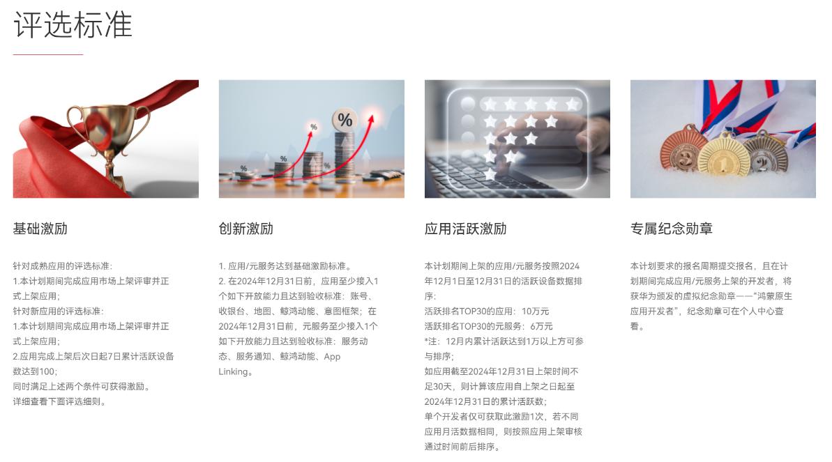 開發者需要在計劃要求的報名週期提交報名,且在2024年10月10日至2024年12月31日完成鴻蒙原生應用、元服務開發,並正式上架至HarmonyOS NEXT應用市場。