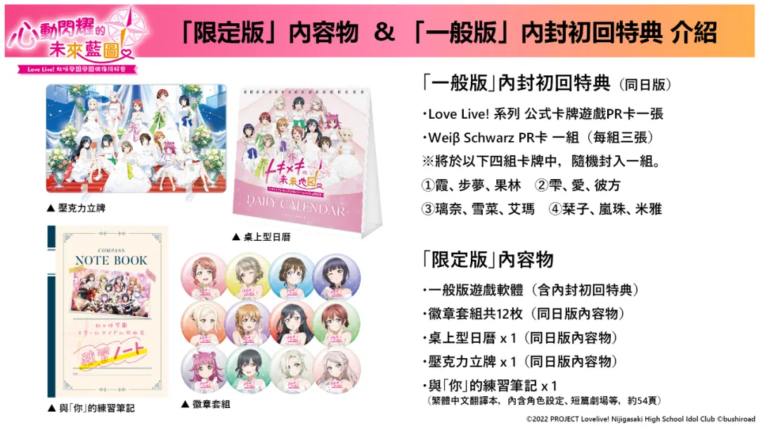 發行商傑仕登宣佈,視覺小說《Love Live! 虹咲學園學園偶像同好會 心動閃耀的未來藍圖》中文版2025年4月24日推出,同時公佈了標準版和限定版內容物。