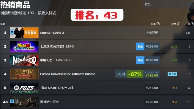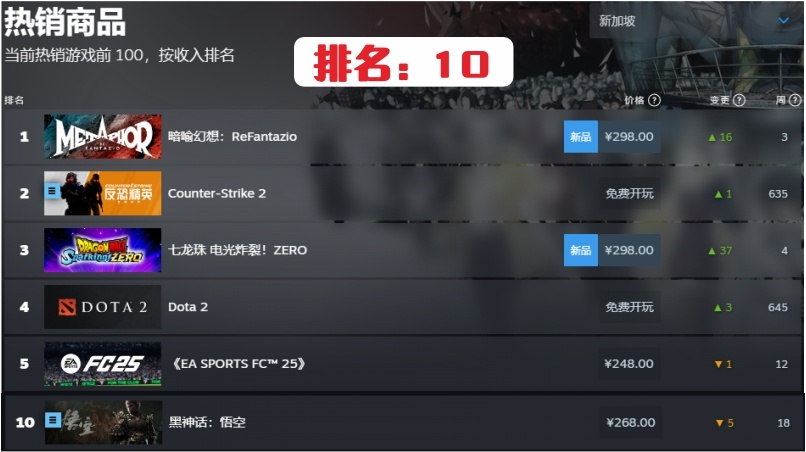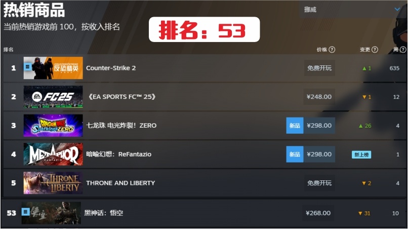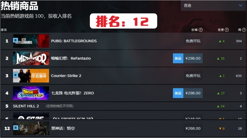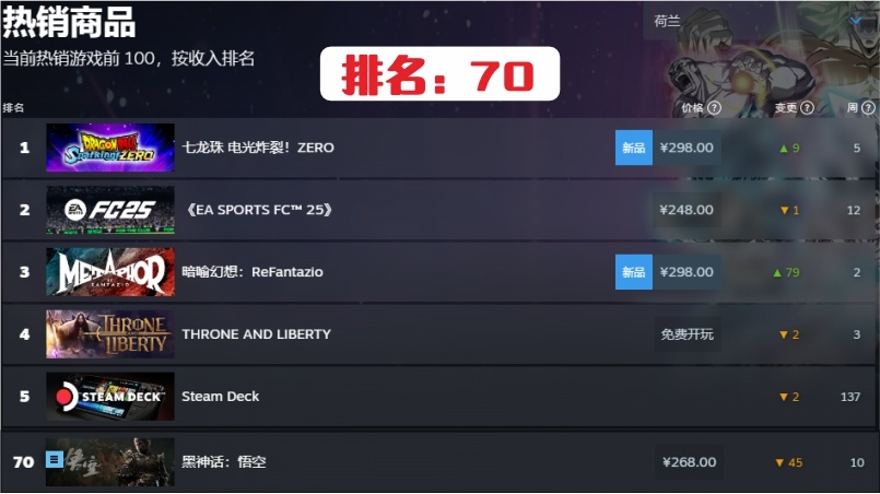 遊戲在8月20日發售後,全球各國或地區銷售排名都在NO.1。到目前發售約兩個月了,我在steam上銷售排名上簡單的做了個各國或地區的目前排名統計。有掉得非常快的,也有任然堅挺的國家,具體如下:
