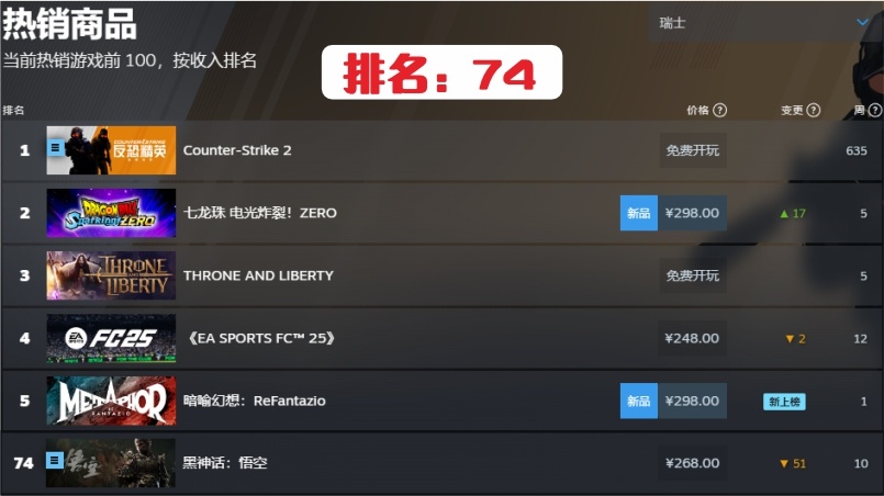 23.瑞士第74名,連續在榜時間10周