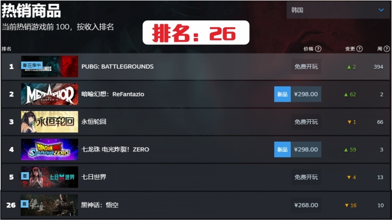 29.韓國第26名,連續在榜時間10周。沒想到在韓國的銷售排名掉的挺慢。