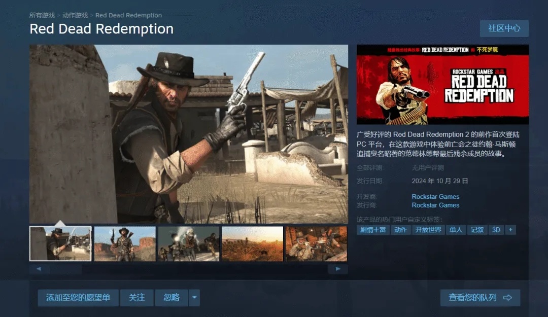 《荒野大镖客:救赎》将于10月29日登陆Steam、Epic、R星商城,预购已开启,Steam国区售价249元。PC版包含游戏本体及DLC「不死梦魇」,增加了PC专属增强功能,支持原生4K分辨率及21:9、32:9显示屏。