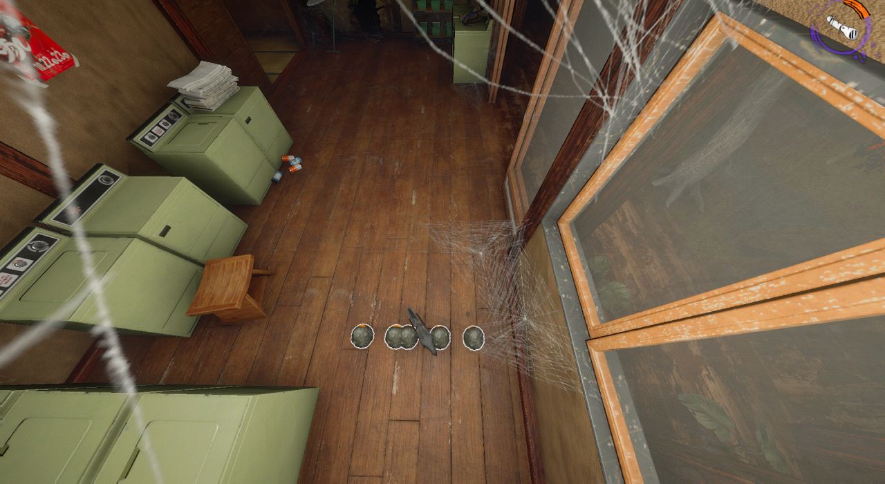 (六)關於zara:最喜歡跟zara貼貼(除了抓我的時候)~地圖上有很多蜘蛛洞,zara會隨機穿蜘蛛洞(與莊園四月很像),每次用紫外線照平息zara後,zara會在地圖上隨機吐兩顆蛋(有隊友被抓走後也會在地圖上隨機吐兩顆蛋),怕死的北北們前期可以收集電池,將zara照平息,等她吐完蛋之後再去找(比較費時間)。不怕死的北北們可以選擇直接送。這個時候推薦讓帶靈感的北北們來看位置報點(前提是得燒一個蛋)。Zara狂暴之後會隨機結網攔路,北北們可以拿紫外線燒掉~