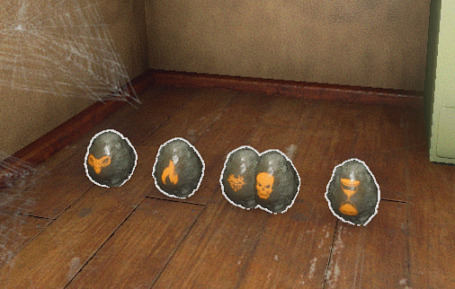 (四)關於蛋:開完鬼後zara會立刻吐一顆蛋,可以直接拿去洗衣房,讓帶快工的隊友來清洗,其他隊友找蛋。每個蛋的圖案不一樣,每一把吐蛋的順序也不一樣。10個蛋對應10個位置不一樣的祭壇。前期zara會吐5個蛋(一定要清點北北們,不然後面會出bug,最後一個蛋不吐)未清洗的蛋上面會有綠色像苔蘚一樣的東西附着,清洗完成的蛋是有明顯圖案的,北北們找到蛋記得分清哦。蛋的刷新數量固定是5個,所以北北們是不能囤10個蛋滴。推薦北北門優先燒二樓/離無敵點距離較遠的蛋,這樣比較安全。可以把6號房、儲藏室、大廳、樓梯拐角的蛋可以留在最後燒。會卡燒的北北們優先留儲藏室與6號房。