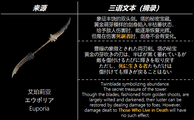 角人文明中似乎沒有死誕者存在,但這把角人的寶藏武器卻提到了它們,很讓人摸不着頭腦。我推測這把武器存在的意義就是在於告知——原始的盧恩能量(黃金萌芽)在早期階段無法壓制死亡,這也是古龍文明滅亡的關鍵原因之一。