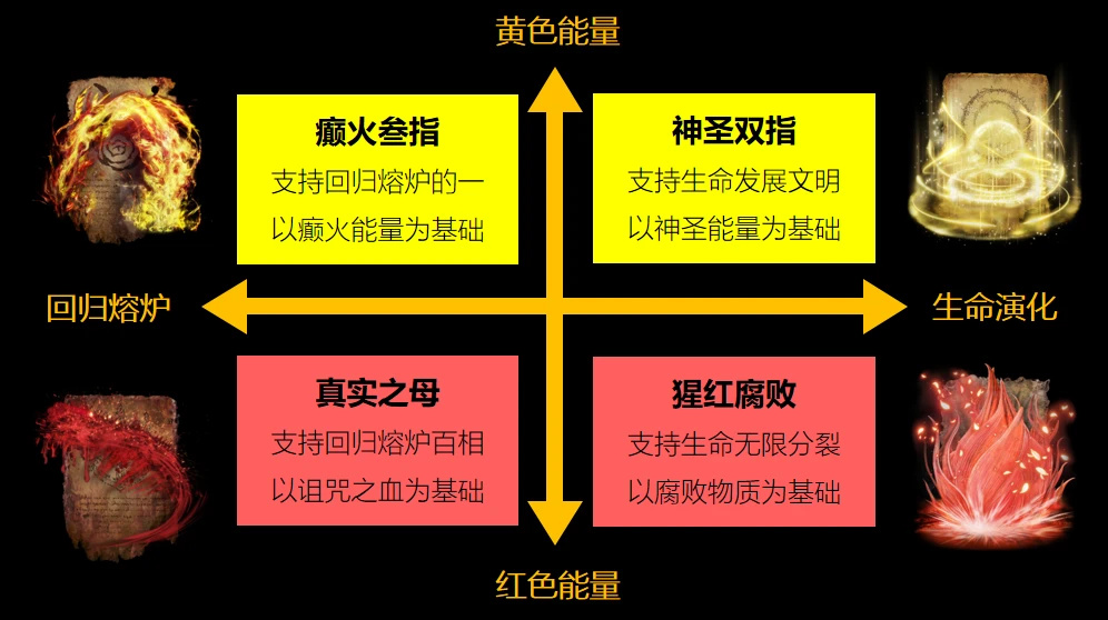 支持生命應該回歸熔爐還是繼續發展?以腐敗物質爲基礎還是盧恩物質爲基礎?叄指、雙指、真實之母、猩紅腐敗這四大勢力可以組成一張勢力象限圖。其中,與真實之母相關的重要衍生概念,就是褻瀆。