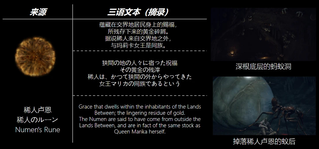 稀人在永恆之城附近的聚集地可能就是大樹根附近的螞蟻洞。之所以這麼認爲,是因爲螞蟻洞裏的蟻后會掉落遊戲中極其罕見的“稀人盧恩”(而且是大放送,打一個爆一個)。另外,無上意志的最初起源“艾爾登流星”禱告也在這裏拾取,暗示性很足。