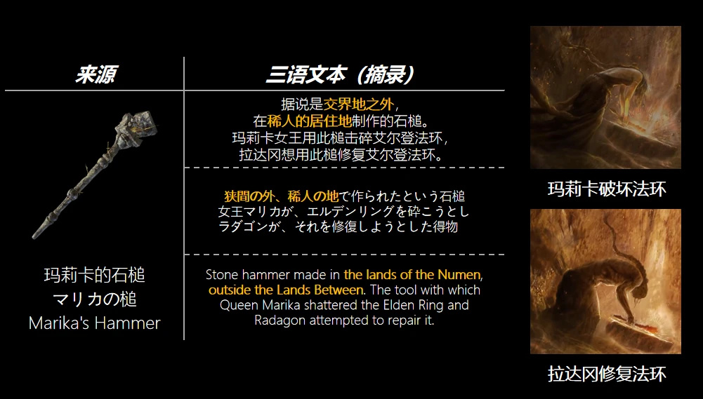 石槌的能力不言自明,但文本里有趣的地方在於“交界地外”這個說法。從目前來看,稀人已知的兩個居住地——巫者村和永恆之城都屬於交界地內,因此我推斷,瑪莉卡曾經是有一段時間離開過交界地的。這也能對上“她爲什麼會認識荷萊露”的疑問。