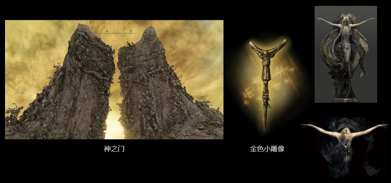 神之門由無數屍體組成,它的形狀也是後來女神瑪莉卡的經典姿勢——即是承接,也是受罰。