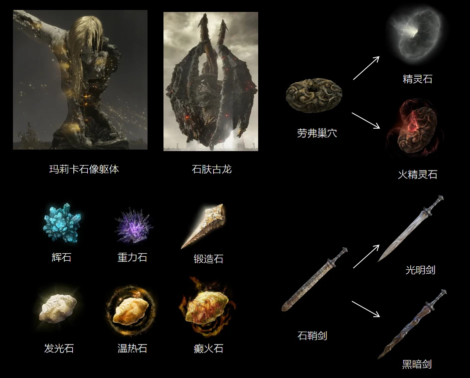 但話又說回來,石質皮膚又算是什麼重要線索?同樣的,在前幾期已經敘述過,岩石正是宇宙物質世界中一切能量的起源。從古遺蹟文明中的石鞘劍,精靈石就可以看出角人很早就開始研究岩石的本質了。輝石、隕星石這些也是宇宙中蘊含能量的石頭物質。而與岩石密切相關的最大生命體,正是當前這個時代的法環容器之神——古龍。