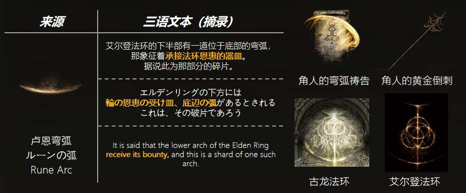 角人的黃金倒刺既是拷問的象徵,也是承載盧恩能量的容器之形。倒刺彎弧同樣也只是古龍法環中彎弧的模仿品。
