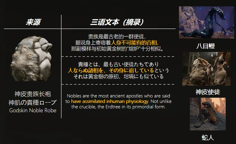 以上只是對石質皮膚和法環容器之間的聯繫推理。實際上可能也不用這麼複雜,因爲關於巫者與稀人,從名稱上也可以猜出不少東西。