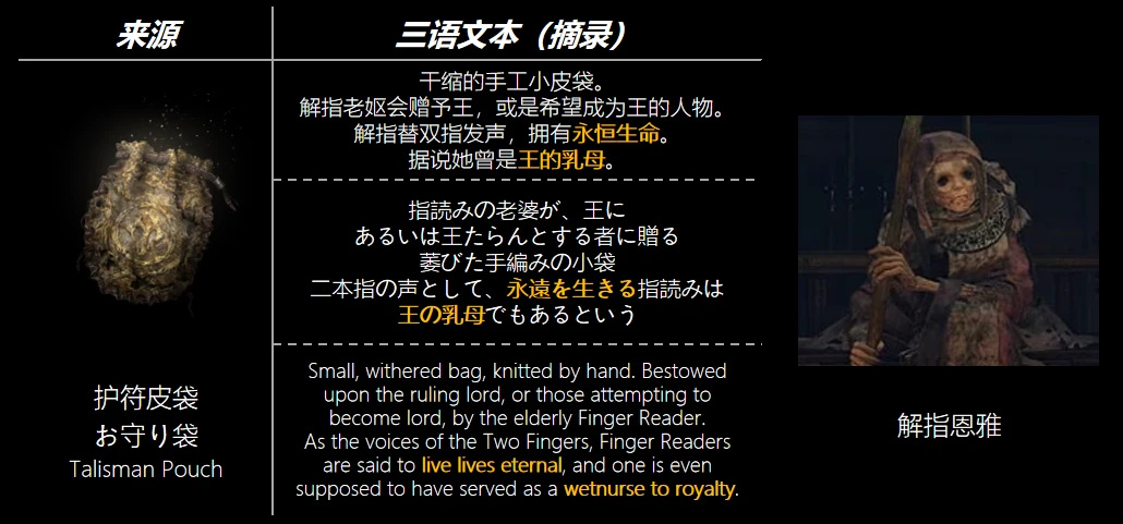 乳母這個身份在宮崎英高世界觀從來不是什麼小人物(《血源》的梅高奶媽、《魂3》的主祭艾瑪)。由此至少可以判斷,這些老婆婆們即便不考慮解指的技能,其身份地位也絕對不低。