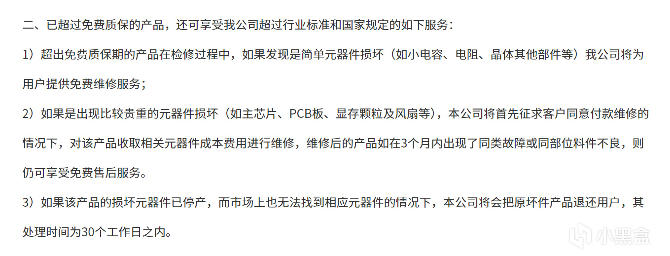 影馳耕升這些同德系品牌都是互相貼牌,保修政策是一模一樣的,大致來講就是,保修期間內支持個人送保,過保後,簡單元器件的損壞可以免費維修,貴重的得付費,如何衡量簡單還是貴重,它們也寫的很明白,具體如下圖
