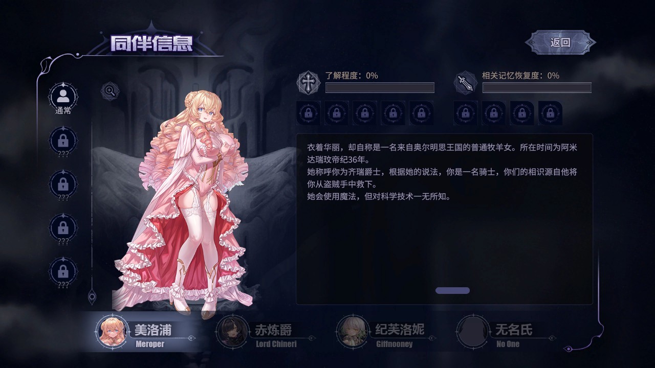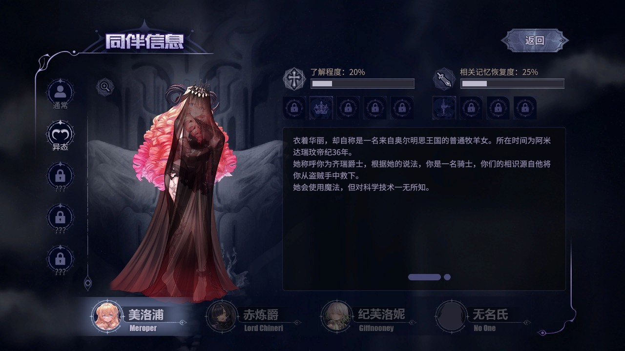 同伴信息,可以看到每位女主有5個形態、9個故事,其中,小美的第二形態在Demo後面會出現,這裏提前放出來了。類似羊角魅魔的模樣。