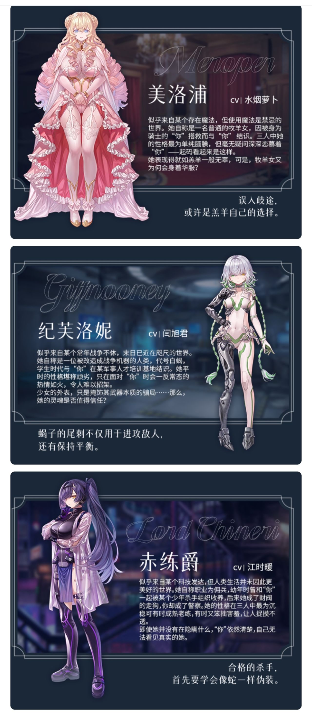 三位女主分別身處三個時代。就簡稱爲魔法時代,人機時代,賽博時代吧。