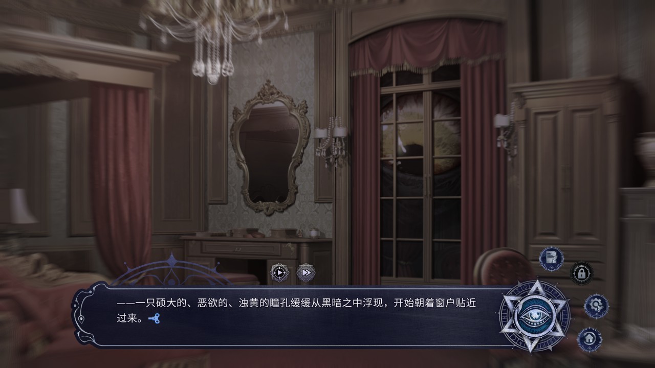 突然,一聲驚呼,冒失鬼小美拉開了窗簾,一隻碩大的眼睛出現了!!(惡魔之眼?)很有克蘇魯的味道。
