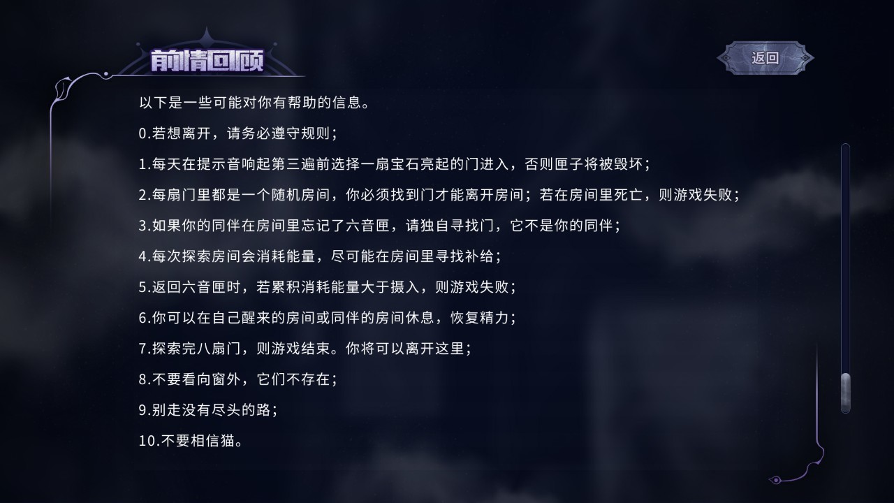 數了下,每輪故事,一共有11扇門、10個夜晚,還有一個最終選擇。選擇8扇門就可以作出最終選擇。但門本身或許不止11個,應該有個門池,每輪隨機一些出來。