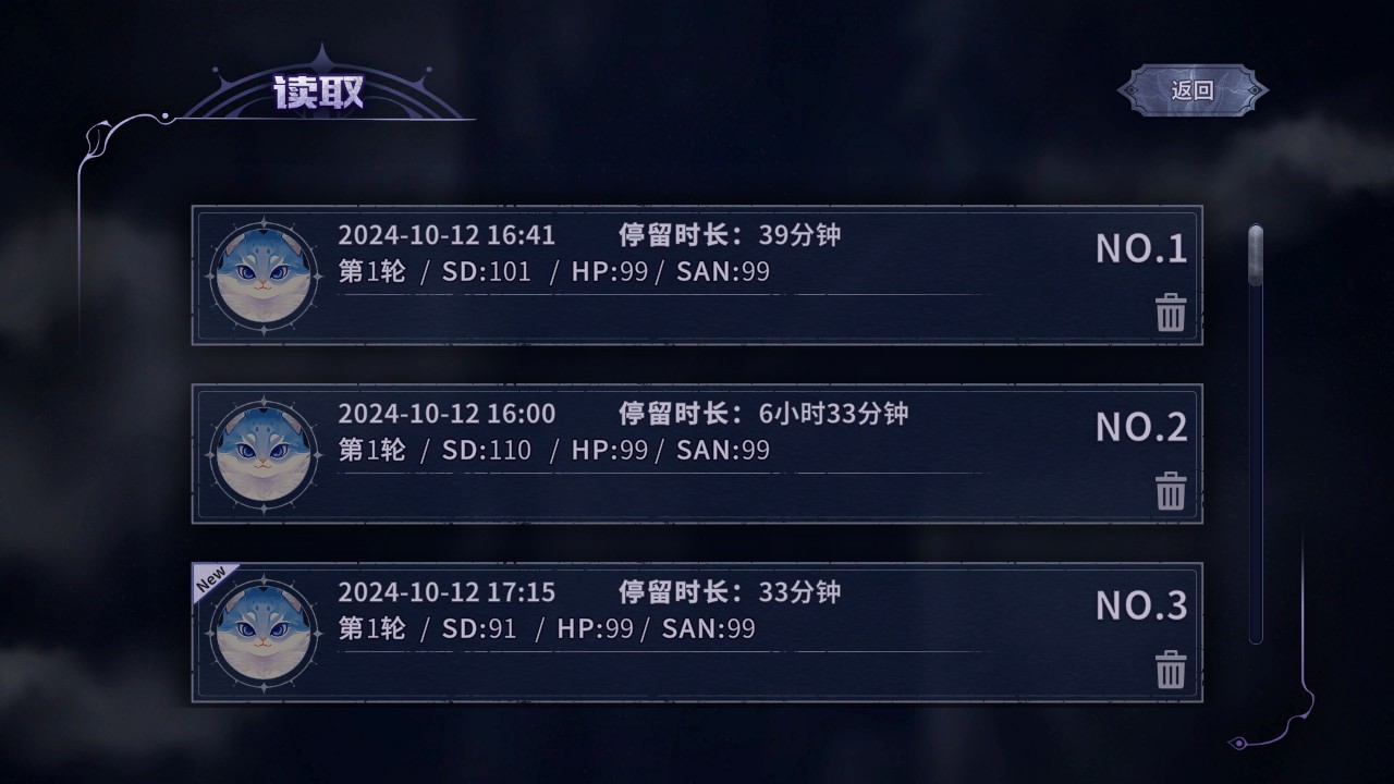 存檔頁面會顯示是第幾輪,而且有三個數值的數據:SD、HP、San。HP是生命,San是理智,SD沒有說,猜測是魂塵吧,Soul Dust。
