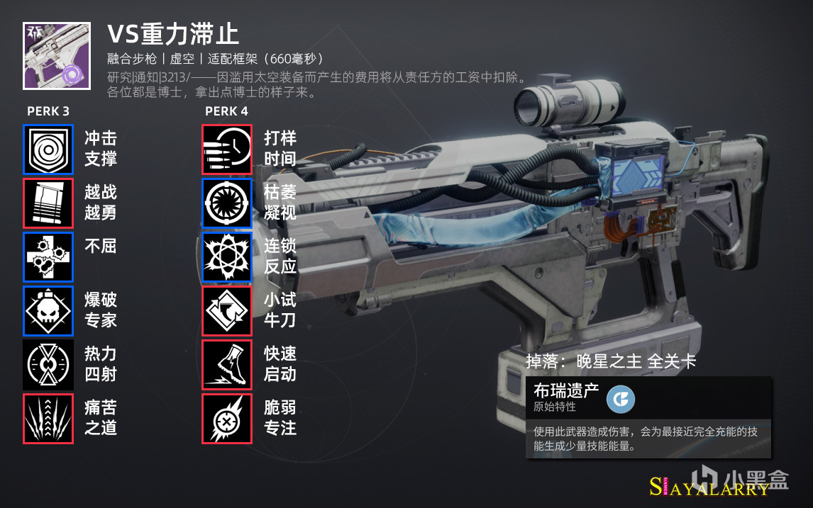 • PVE:枯萎凝視可以削弱敵人(承受額外15%的傷害,第一發只能上削弱不能同時觸發額外傷害),可能在特定場合下有用,搭配爆破專家。我覺得這把融合更多的作用是清怪,連鎖反應+爆破/衝擊支撐/不屈