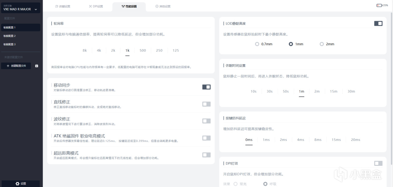 在驅動方面,支持ATK HUB驅動以及ATK HUB網頁驅動,可以非常便捷的去管理設備,查看鼠標電量,並且進行DPI調節,回報率,自定義宏,LOD的靜默高度,休眠時間,或者是防抖延遲,像直線修正和波紋修正,應該大部分鼠標都有,但是我沒想到怎麼還有移動同步,職業電競模式,以及超遠距離模式啊,你小子怎麼這麼全能啊,在職業電競模式下,延遲低至0.125ms,按鍵延遲能低至0.4ms,就是有點耗電。
