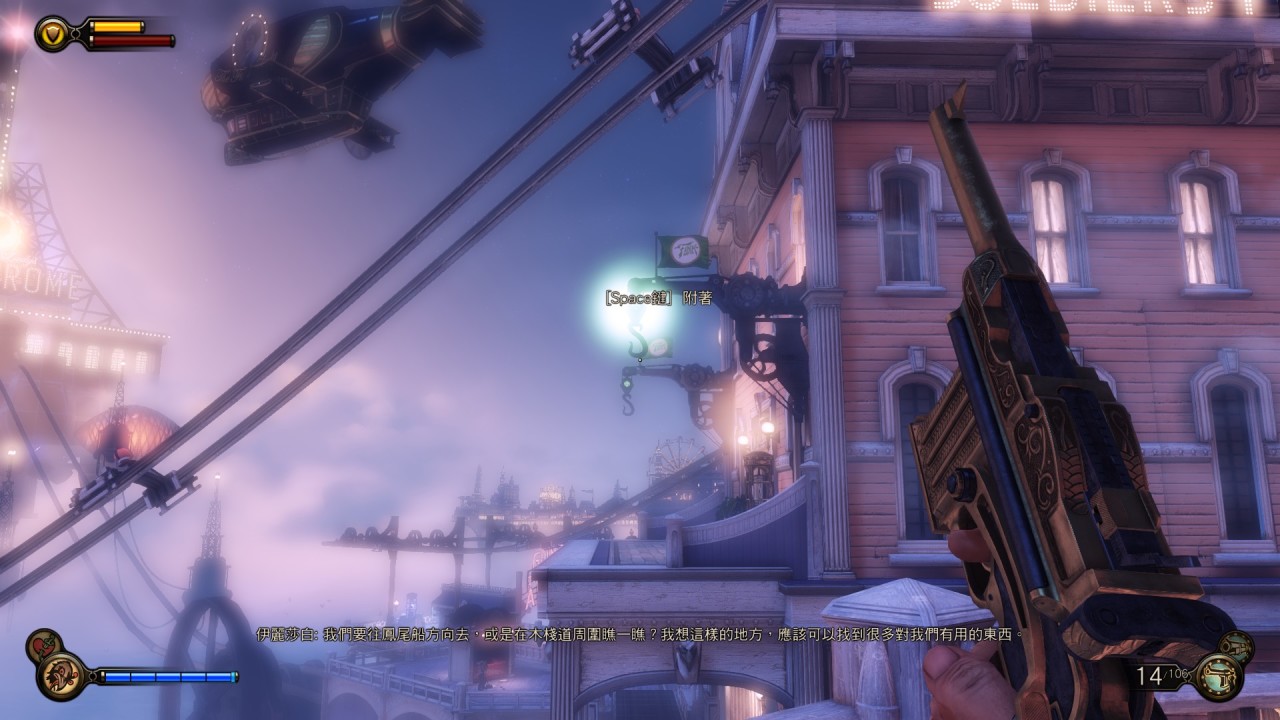 遊戲的畫面比較的卡通風格,作爲一款老遊戲確實不能以現在的建模精細度來要求它。但在美術設計上它能保證足夠的精彩。初登上哥倫比亞就會被那華麗的老西式建築吸引,配上暖光色調把整個哥倫比亞塑造成了一個人間天堂。再配上各個區域以一種類空間站接軌的形式連接與斷開,再加上空中各種滑索軌道和運貨工具,還有那老派的浮空艇,讓整個場景都充滿了科幻與魔幻相結合的美。