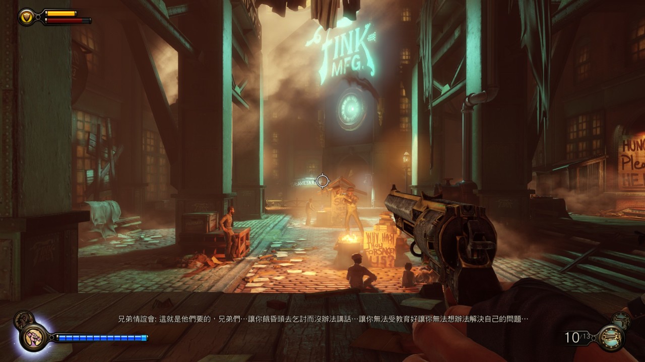 天空之城哥倫比亞的設計特別有意思,它將蒸汽朋克和復古的哥特風格進行結合,形成了一種別樣的美感。而哥倫比亞上的人們紙醉金迷,康姆斯托克的個人崇拜,貧民窟底層的水深火熱,又讓這座城市多了一種異樣的魔幻感。