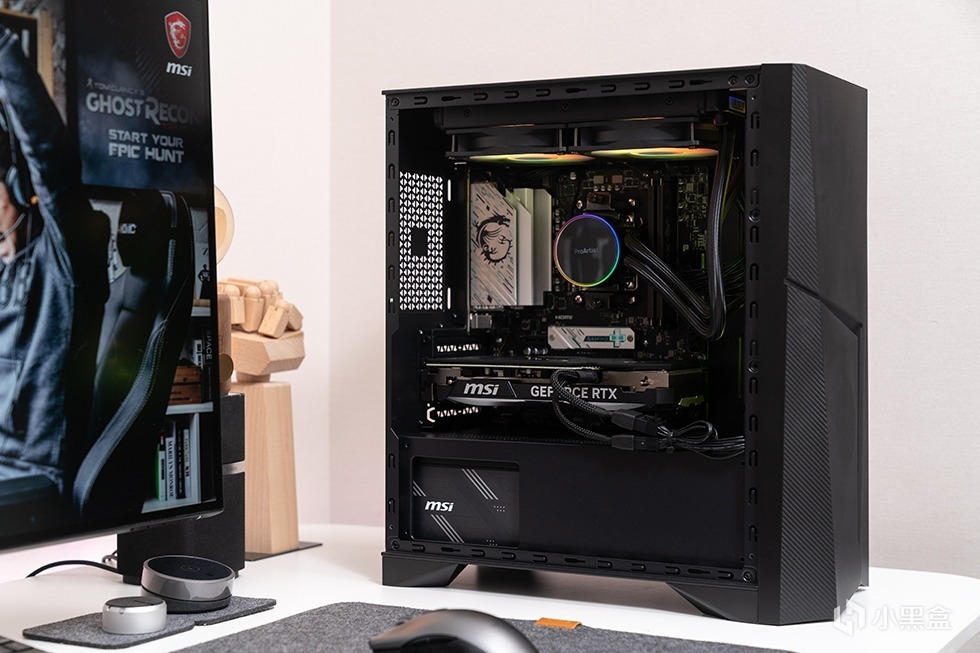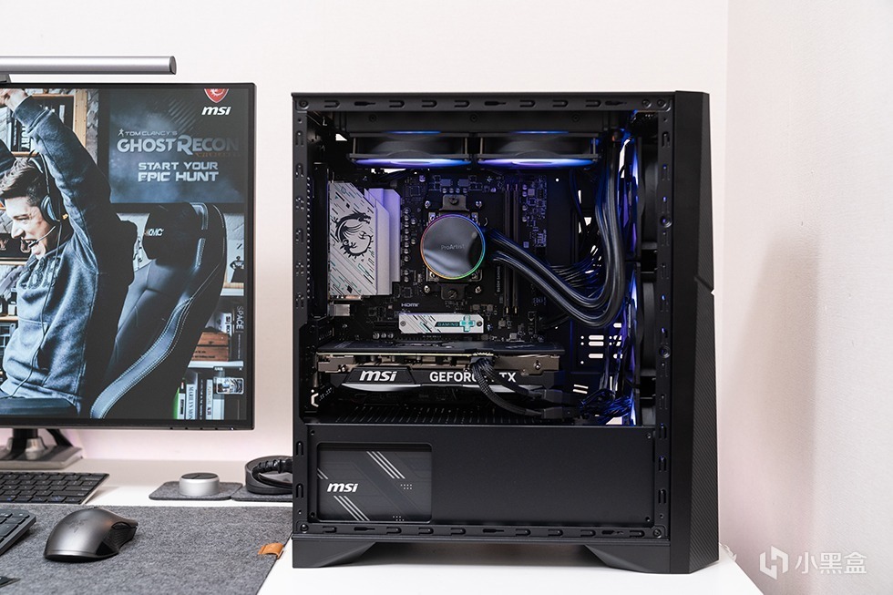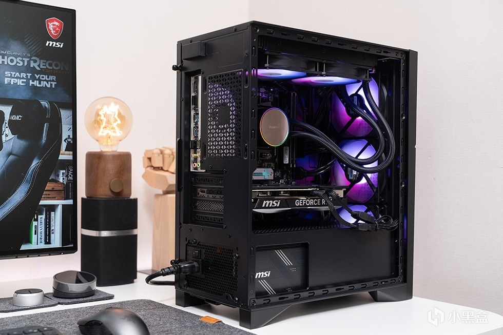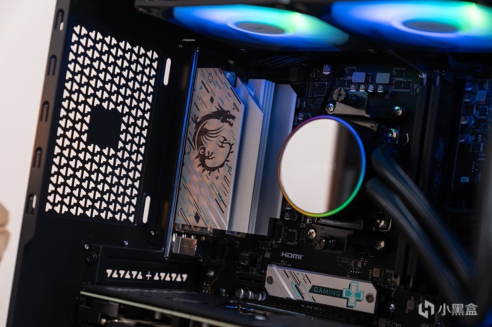 打開側板後可以看到內部爲傳統的上下分倉結構,上方爲主板區域,配備了MATX主板,採用了240一體水冷散熱,線纜都進行了規整處理,硬件排布整潔,內部空間寬裕,可支持最長320mm長度的顯卡。