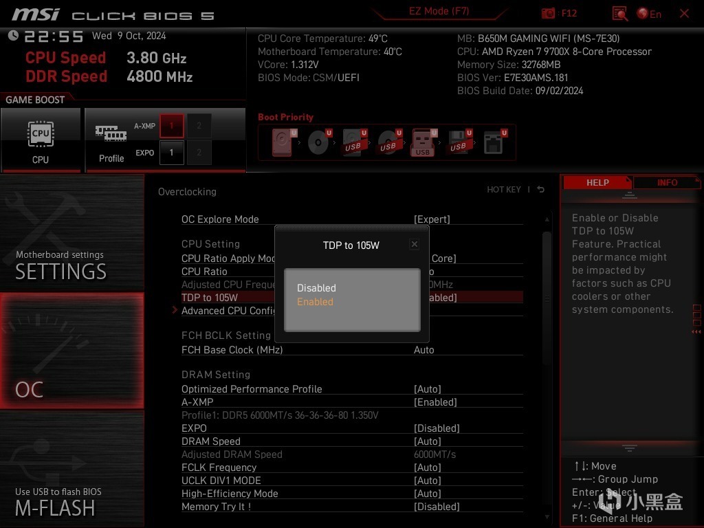 目前微星對於B650主板更新了AGESA 1.2.0.1a版本微代碼,支持105W TDP模式,所以在測試前先進入BIOS解鎖105W,從而獲得更好的性能表現。