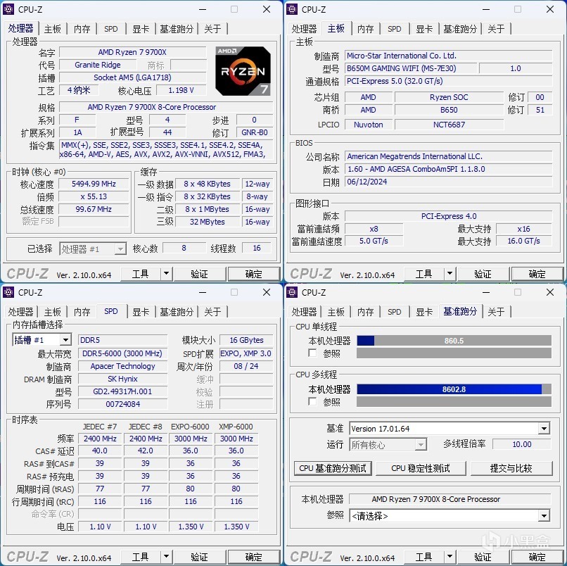 主板方面,從碩大的VRM散熱片上的塗裝就可以分辨出主板爲微星B650M Gaming WIFI,標準MATX 版型,6 層 2 盎司銅 PCB 設計,單 8-pin CPU 輔助供電,6+2+1 相供電設計,足以激發AMD R7 9700X處理器的全部潛能。