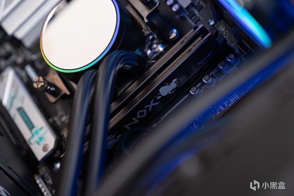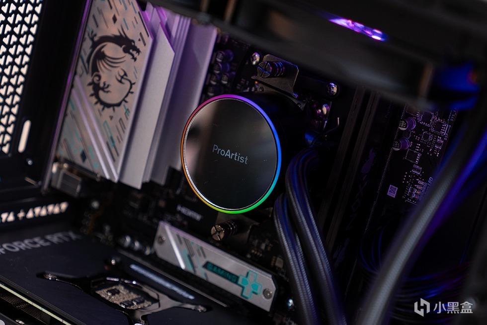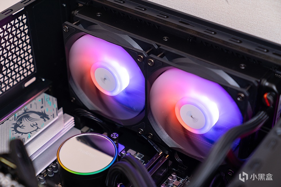 散熱方面,採用來自散熱大廠雅浚EA3 240SE一體水冷,自帶2把12cm RGB風扇,機箱前部的3把RGB風扇同樣來自雅浚,支持ARGB神光同步,形成前進風頂出風的散熱風道。