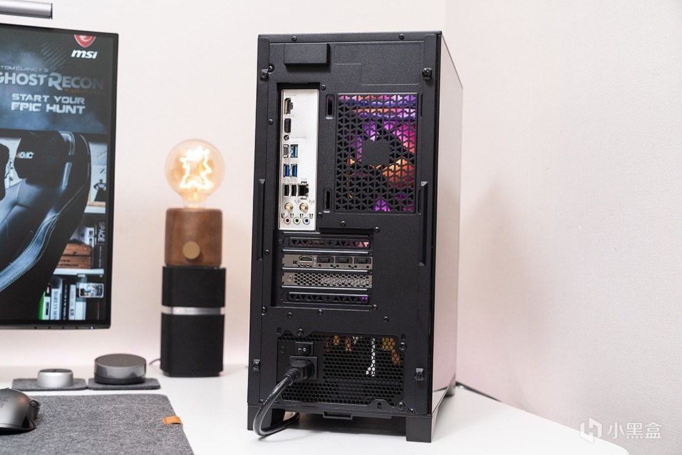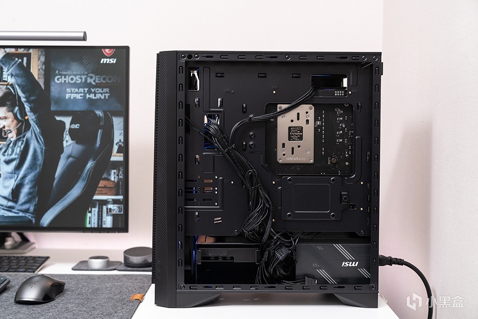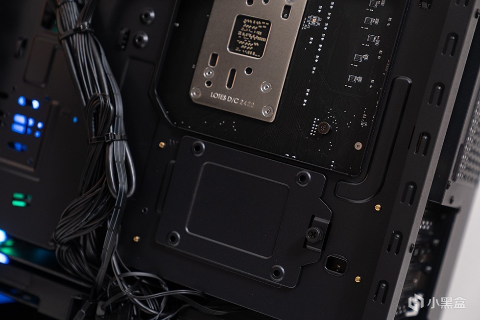 最後看一下機箱背倉,背倉有充足的理線空間,所有線纜均通過紮帶和過線孔固定,整體理線較爲規整乾淨。