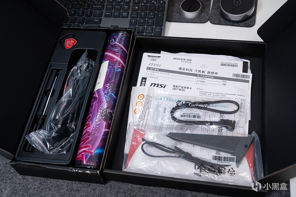 隨機附件分成2個配件盒,除了電源線、金屬龍盾LOGO磁吸貼、wifi電線、保修卡說明書等常規附件外,還附贈了一塊鼠標墊,以及一把長柄螺絲刀(方便用戶自行動手拆裝)。