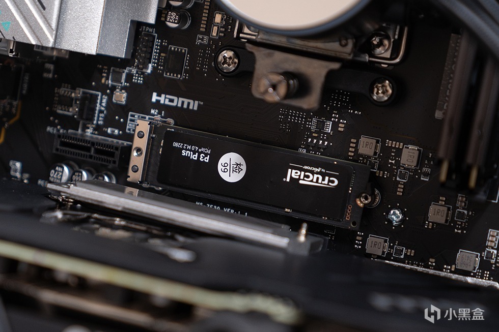 儲存方面,主板自帶2個PCIe 4.0X4高速M.2槽位,第一個槽位自帶冰霜散熱馬甲,裏面配備了鎂光P3 Plus 1TB SSD,羣聯E21主控搭配鎂光原廠顆粒,方案成熟性能穩定,最高順序讀取速度5000MB/s,順序寫入速度3600MB/s,具有220TBW的寫入壽命,無論是容量還是速率,都可滿足日常應用。
