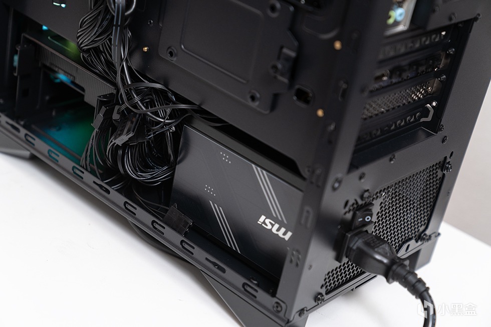 下方的電源倉的電源安裝位置做了開窗設計,露出MSI電源的LOGO,提升品牌辨識度。