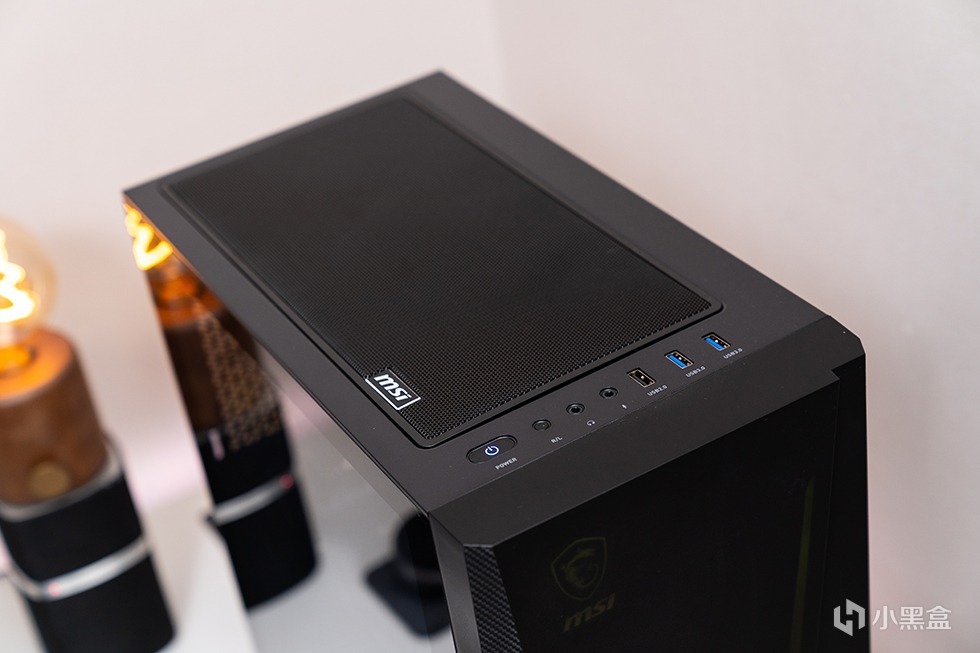 機箱頂部爲mesh通風面板,I/O接口布置在頂部前端,從左到右依次提供了電源鍵、RGB燈光模式切換按鍵、1組音頻接口、1個USB 2.0接口和2個USB 3.0接口,基本滿足日常使用。