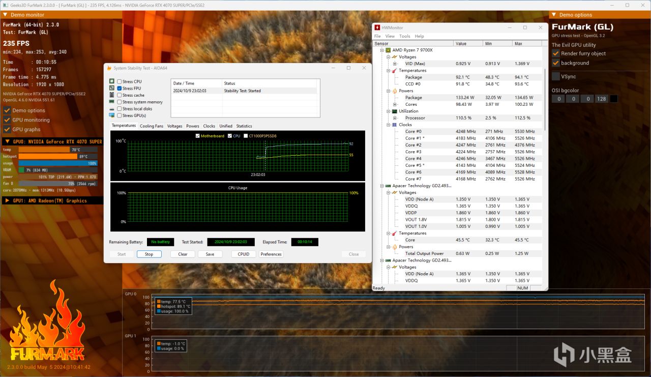 AIDA64以及Furmark雙烤溫度,CPU功耗134W,最高溫度92℃,顯卡溫度78℃。