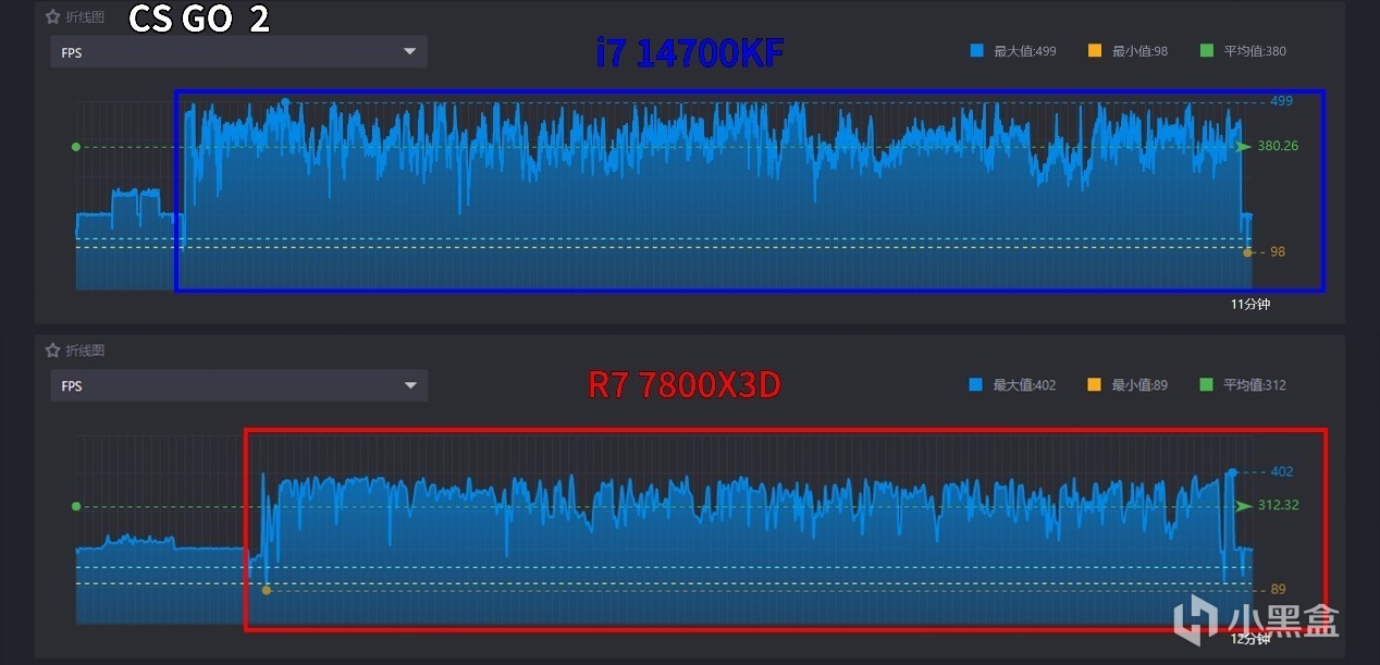 首先是CSGO2當中,測試的場景是dust2,死亡競賽。由於這個遊戲比較喫CPU的單核性能,所以在此7800X3D沒能發揮出大三緩的優勢,而且單核性能較差的緣故,導致落後於14700KF。