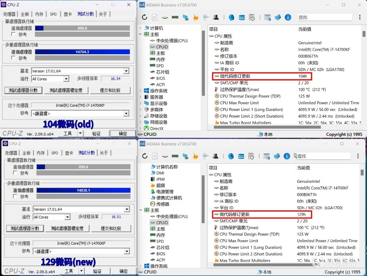 這裏順便也對比一下14700KF,在新發布的129微碼與老版本104微碼下的性能差距。可以看到基本沒有什麼性能影響。