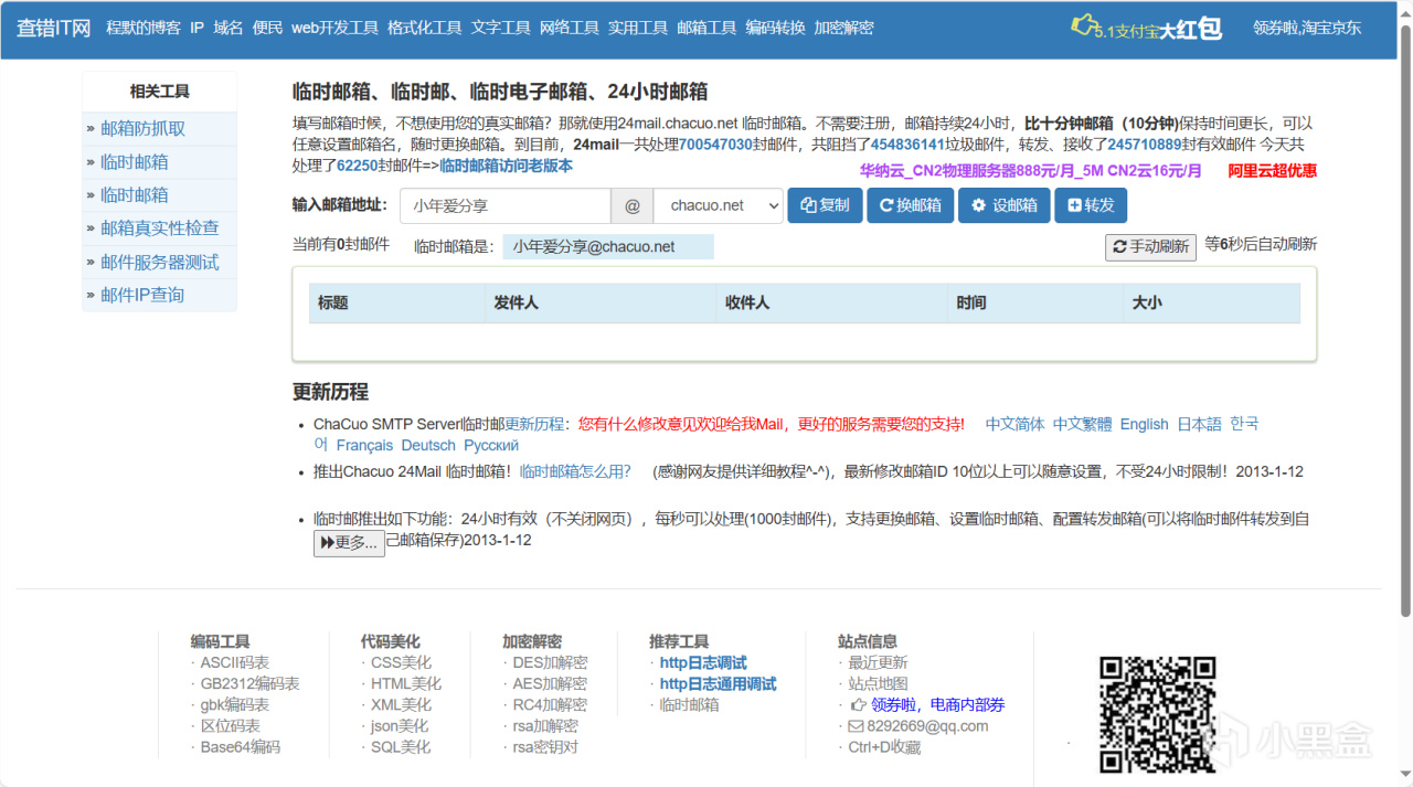 提供24小时临时邮箱地址、保护个人隐私的效率工具,用后即抛, 避免注册时接收骚扰信息