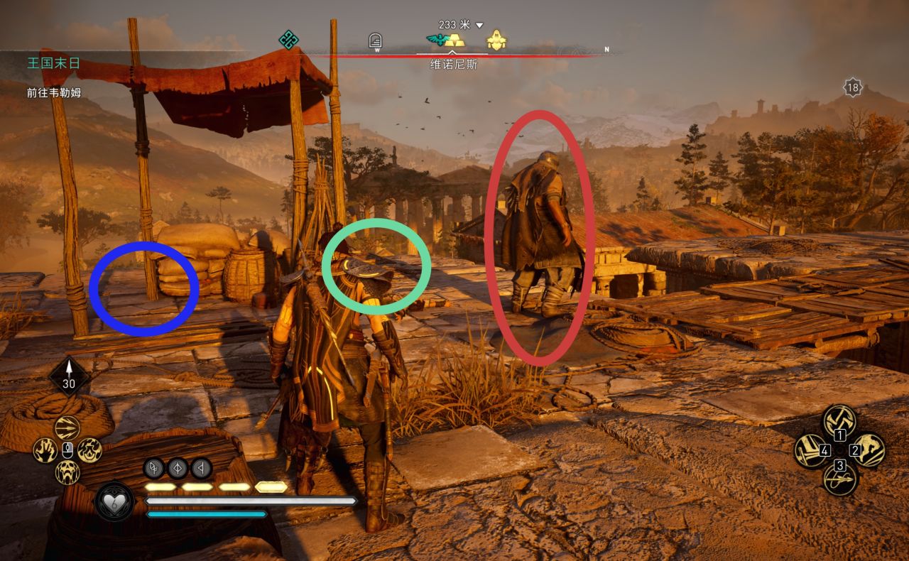 蓝圈里面是罗马文物,绿圈里面会有一名坐着的敌人,我们上来后可以先暗杀掉,红圈就是我们成就的工具人“巨人”