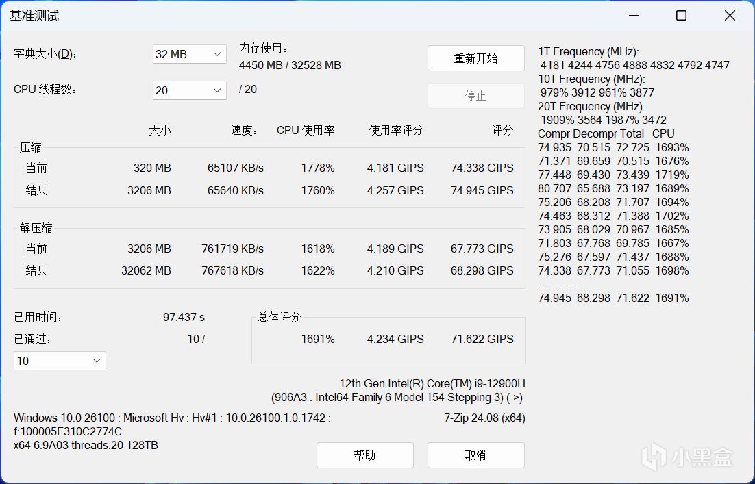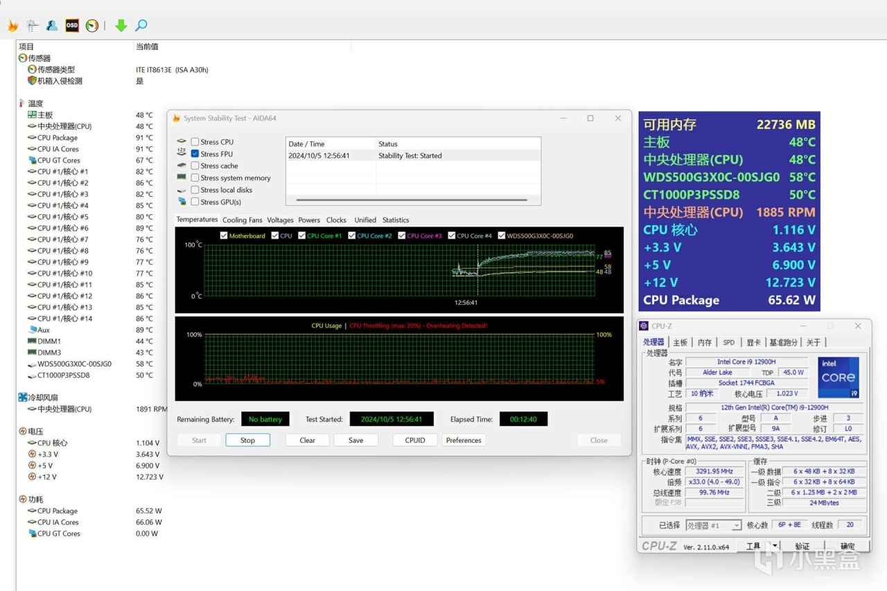 零刻GTi12 Ultrra搭载第12代英特尔酷睿i9-12900H处理器,14核心20线程,最大睿频频率5.00 GHz,缓存24 MB,基础功耗 45W。我使用3款测试工具对CPU进行了压力测试,结果如下,供大家参考。