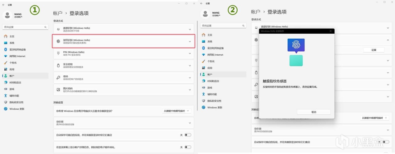 操作路径:设置-账户-登录选项-指纹识别(Windows Hello)
