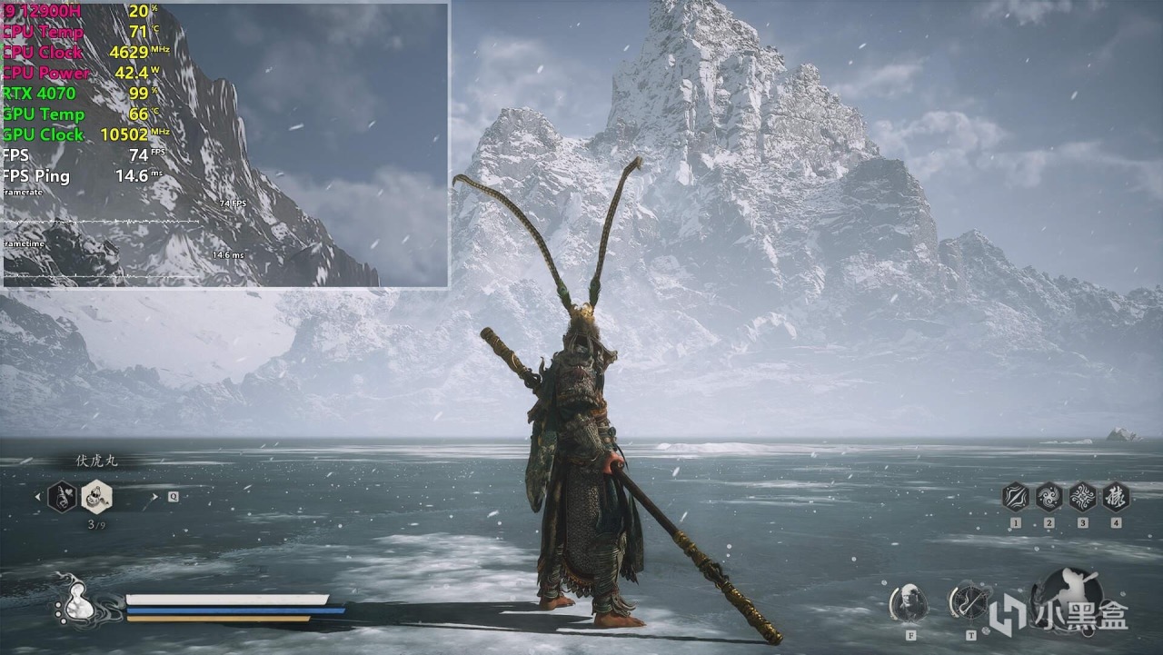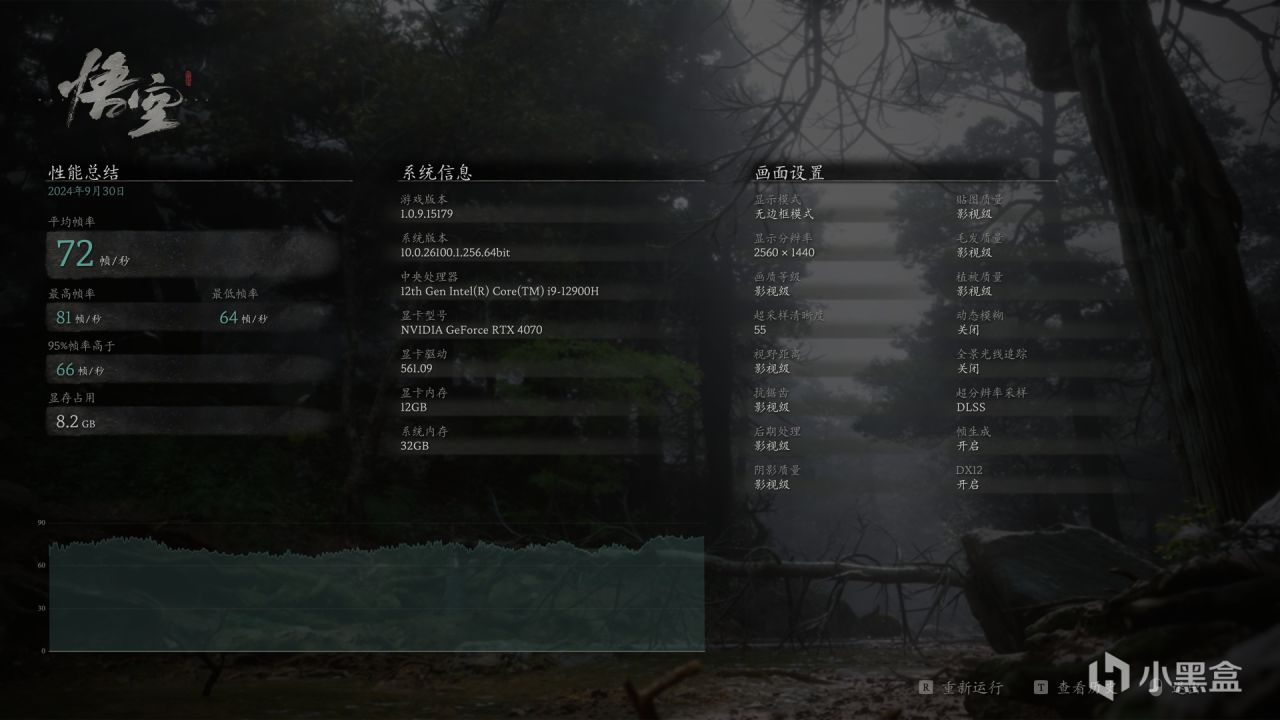 2K分辨率+影视级画质+超高光线追踪+DLSS均衡+帧生成,《黑神话:悟空》Benchmark测试平均帧数63,最高帧数75;游戏内帧数基本能维持在70左右。