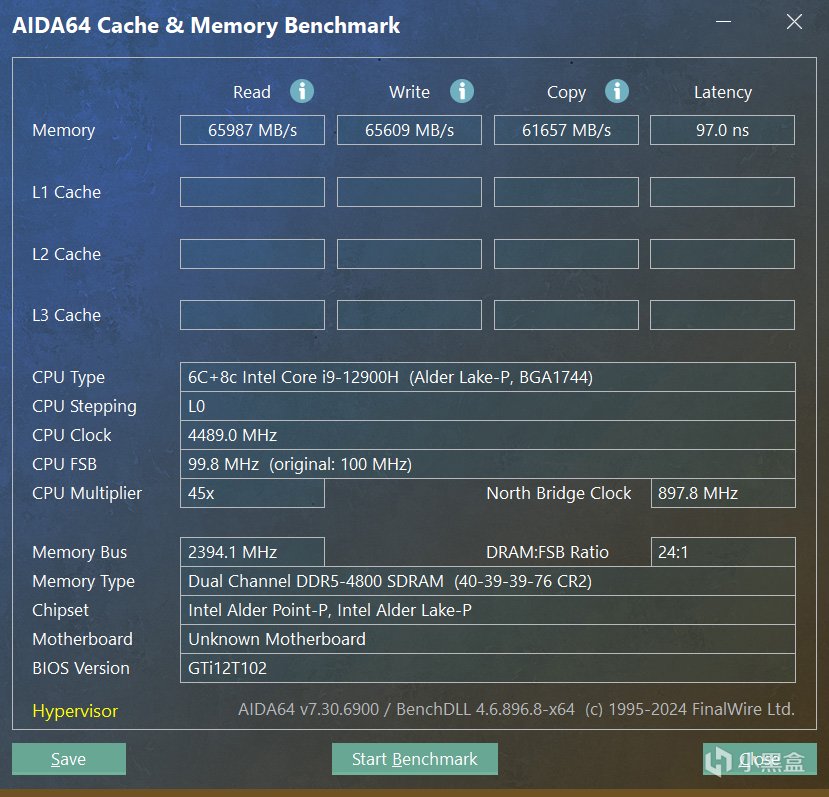 内存是英睿达32GB(16GBx2)5600MHz双通道 DDR5内存,不过i9-12900H最高只支持4800MHz DDR5内存。AIDA64内存性能测试结果:读速65987MB/s,写速65609MB/s,拷贝61657MB/s,延迟97ns。