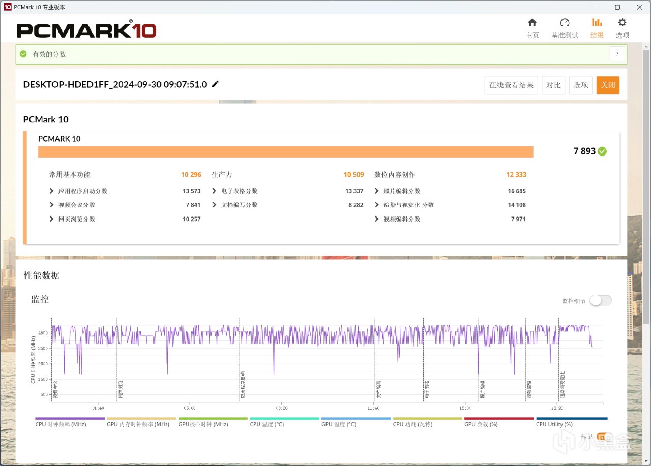 PCMark 10的测试项目几乎涵盖了现代办公中的所需要的所有应用场景,测试工作负载包括:网页浏览、视频会议和应用程序启动、文档编写、图片编辑、视频剪辑和渲染等。零刻GTi12 Ultrra综合得分7893,其中,常用基本功能10296,生产力10509,数位内容创作12333。