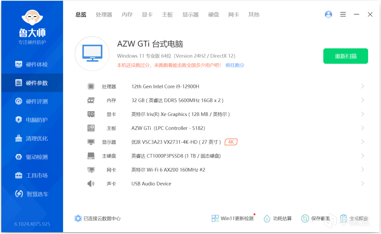 硬盘是英睿达P3 1TB PCIe 4.0x4 SSD,CrystalDiskMark测试顺序读取速度5199MB/s,顺序写入速度3081MB/s。